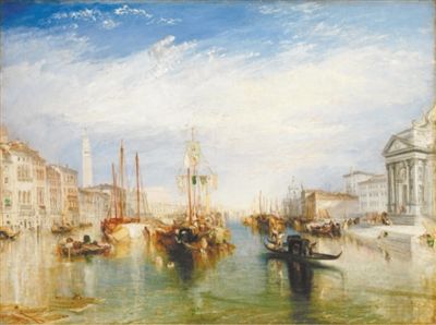 在自然风景描绘中,光线是不可或缺的元素。大气光线本身不可见,只能通过云彩或固体物质来表现。透纳大部分作品都专注于探索光线的表现方式,利用色彩的对比营造氛围。如《威尼斯节》、《威尼斯大运河》(见图,资料图片)等威尼斯系列画作就利用不同颜色的效果和反效果呈现光线的明暗变化。因为对光线的出色把握,透纳也被称为“光线画家”。