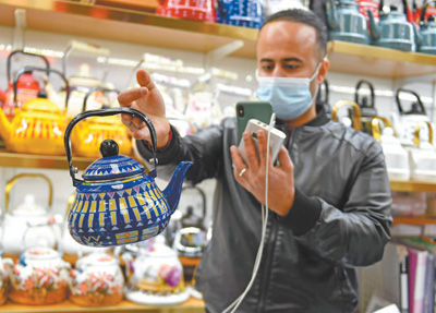 2021年1月14日,也门客商在义乌国际商贸城选购茶壶,同时通过视频向沙特客户介绍价格和库存。 |