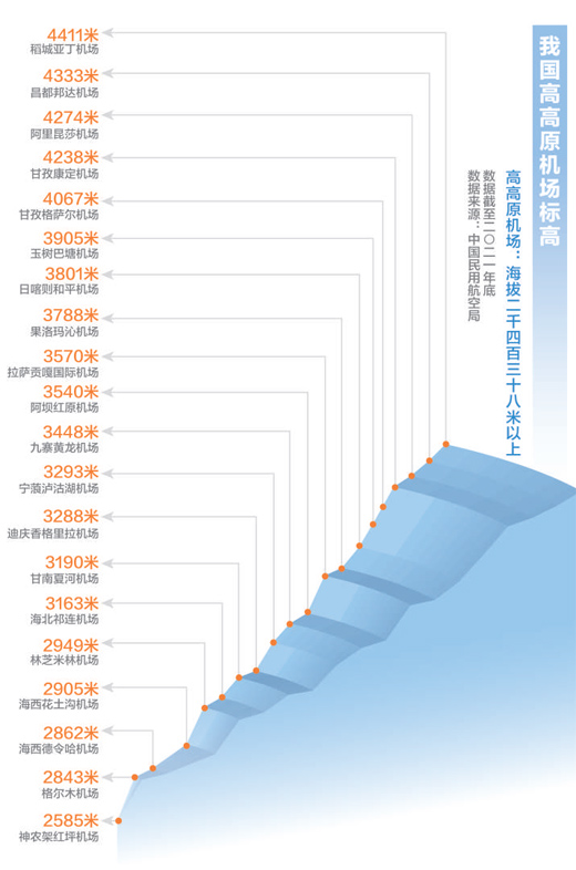 机场标高在1524米至2438米的机场称为“高原机场”。而“高高原机场”,指海拔高度2438米以上的机场,所在地区地形复杂、气候恶劣、空气稀薄,对机场建设、航空器运维和人员素质都提出了更高要求。截至2021年底,我国共有已投运高高原机场20个,其中稻城亚丁机场海拔4411米,为世界海拔最高的机场。高高原机场不仅为当地带去人气,推动经济社会发展,还显著改善中西部地区交通条件,为建设交通强国发挥重要作用。
