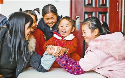 1月17日,贵州省黔西市雨朵镇雨明社区,一名志愿者(左)正在和小朋友们掰手腕。