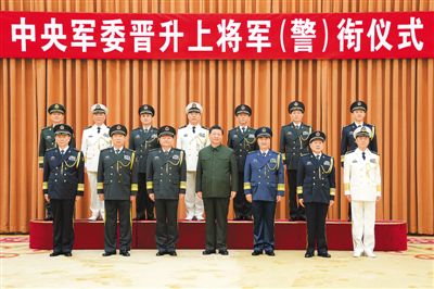 晋衔仪式在嘹亮的军歌声中结束。随后,习近平等领导同志同晋升上将军衔警衔的军官警官合影。