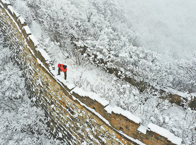 1月23日,北京市怀柔区箭扣长城,长城保护员蔡景顺冒雪巡查。