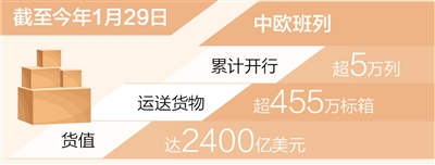 本报北京1月29日电 (记者陆娅楠)中国国家铁路集团有限公司最新数据显示:截至今年1月29日,中欧班列累计开行超5万列、运送货物超455万标箱、货值达2400亿美元。