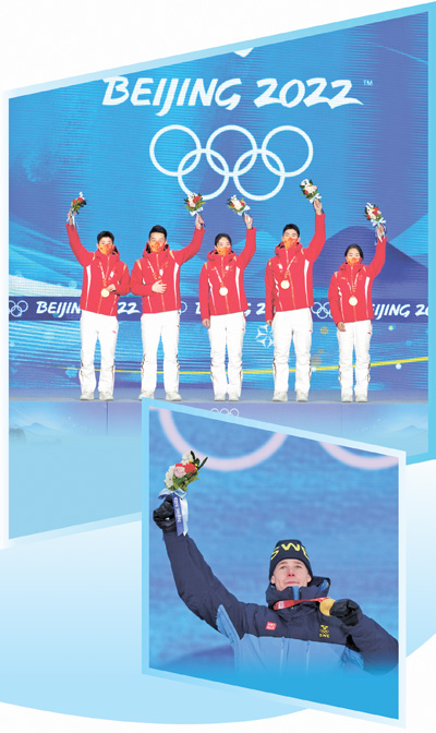 伴随激昂向上、磅礴大气的背景音乐,各个项目颁奖仪式进行。第一个进行的是越野滑雪女子双追逐项目的颁奖仪式,这个项目产生了本届冬奥会首枚金牌,获得者是挪威运动员特·约豪格。约豪格站上领奖台,还未接过金牌的她已热泪盈眶。“我在这里夺得了个人运动生涯的第一枚奥运会个人项目金牌,实现了我的梦想。”已参加过3届冬奥会的约豪格说。