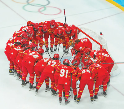 2月6日,中国队球员赛前互相加油。当日,在五棵松体育中心进行的女子冰球小组赛中,中国队以2∶1战胜日本队。 |