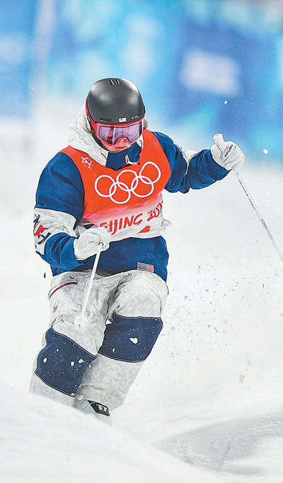 2月6日,获得亚军的美国选手杰琳·考夫在比赛中。当日,自由式滑雪女子雪上技巧决赛在张家口赛区云顶滑雪公园进行。 |