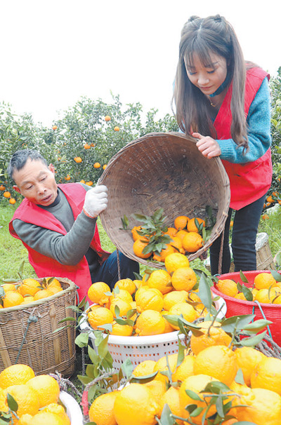 四川省仁寿县板桥镇团圆社区,党员干部帮助果农采摘柑橘。 |