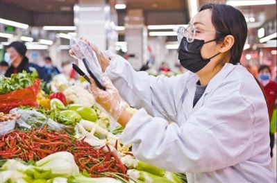 江西省南昌市东湖区贤士湖花园菜场内,检测人员正在对当天采集的菜品进行快速检测。 |