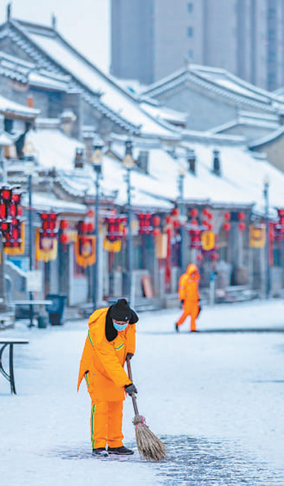 2月13日,环卫工人在内蒙古呼和浩特市玉泉区塞上老街清理积雪。 |