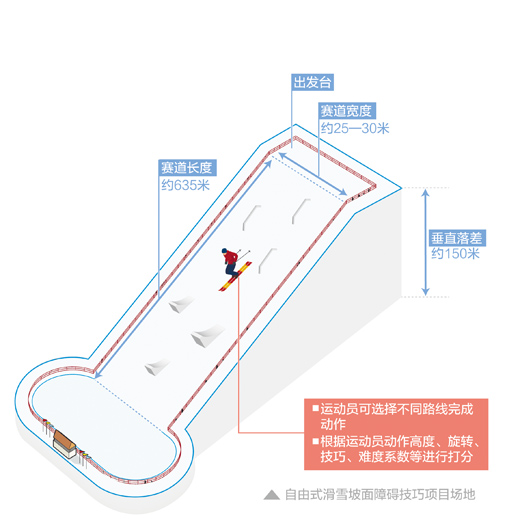 坡面障碍技巧赛道地形复杂,设有多条路线供运动员选择,赛道包括坡面、跳台、轨道等,场地垂直落差最小150米。这两个项目,裁判均根据运动员动作高度、旋转、技巧、难度系数等进行打分。