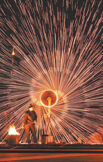 表演者将生铁化成铁水后,在空中打出铁花,形成了流光溢彩的绚丽景象。