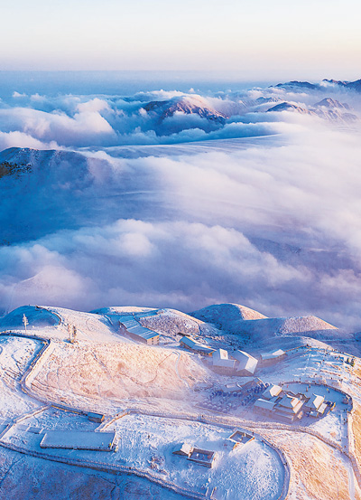 2月24日,江西省萍乡市武功山风景区,山顶银装素裹,云海翻滚,十分壮观。近日,景区加强服务,为游客游览提供保障。