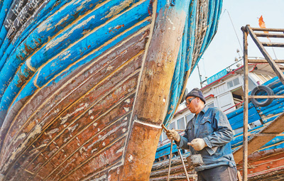 2月24日,工人正在维修木质渔船。