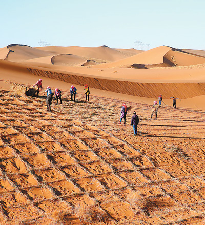 2月28日,在甘肃省张掖市临泽县平川镇,治沙人员正在用麦草埋设阻沙网。