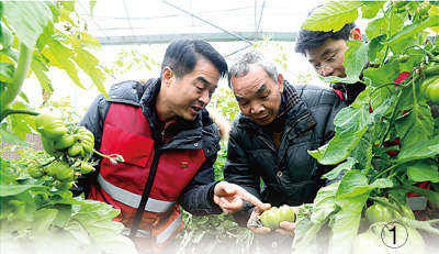图①:广西壮族自治区融安县大良镇古兰村,驻村第一书记(左)给农户讲解番茄管护知识。 韦荣军摄(影像中国)