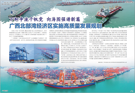 “一湾相挽十一国,良性互动东中西”,生动地描绘了北部湾在“一带一路”中的区位优势。近年来,北部湾经济区凝心聚力积极服务构建新发展格局,抢抓新发展机遇,加快畅通西部陆海新通道,聚焦国际枢纽海港,对标国际一流港口,不断提升北部湾港码头、航道能级,大力发展国际航运网络,优化物流服务功能,推动西部陆海新通道、北部湾国际门户港和现代产业体系建设等取得新成效,多项指标创新高:2021年,北部湾港集装箱航线达64条,其中,外贸航线37条,内贸航线27条;海铁联运班列突破6000列;完成货物吞吐量3.58亿吨,新增6200万吨,新增吞吐量位居全国沿海港口第一;完成集装箱601万标箱。货物吞吐量上升到全国沿海港口第9位,集装箱吞吐量上升到第8位,双双进入全国前十名。同时,北部湾经济区也实现多个事项创首次:钦州港东航道扩建工程建成,北部湾港首次具备通航20万吨级集装箱船能力;成功实现15万吨级集装箱船和30万吨级油轮首次靠泊;首次开行“钦州港—孟加拉国吉大港、印度钦奈港”航线,实现北部湾港至南亚航线零突破;南宁国际铁路港首次开行“南宁—西安(新筑)—努尔苏丹”中欧班列;钦州至钦州东联络线改造完成,首次实现南北钦防四市动车点到点直通。