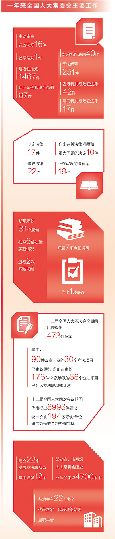 十三届全国人大四次会议期间代表提出的473件议案,已由相关专门委员会全部审议完毕;十三届全国人大四次会议期间代表提出的8993件建议,统一交由194家承办单位研究办理并全部办理完毕……听全国人大常委会工作报告,代表们表示,获得感、成就感满满。