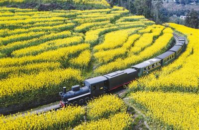 春暖花开,人们纷纷走出家门,踏青赏花,拥抱春天。图为3月8日,四川省犍为县,满载游客的“嘉阳小火车”在花海中穿行。