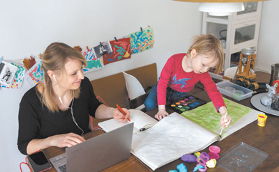 疫情防控期间,德国柏林的一对母子在家中远程上班和学习。 |