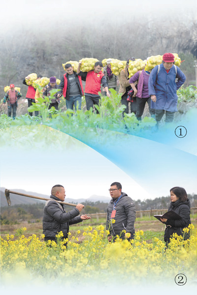 图①:湖南省龙山县靛房镇青年党员干部在先锋村帮助村民采收大头菜。 |