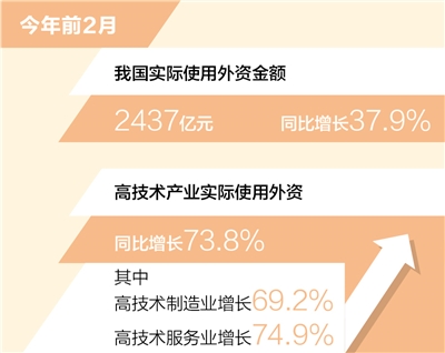 本报北京3月14日电 (记者罗珊珊)记者14日从商务部获悉:今年前2月,我国实际使用外资金额2437亿元,同比增长37.9%。