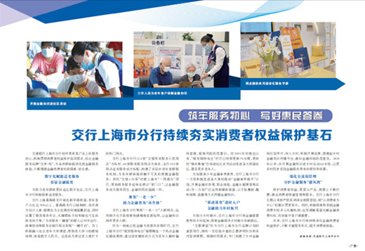 交通银行上海市分行始终秉承客户至上的服务初心,积极贯彻消费者权益保护各项要求,结合金融服务品牌“交享·悦”,为各类群体提供优质金融服务体验,不断增强金融消费者的获得感、安全感。