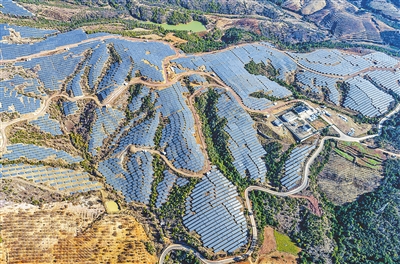 近年来,云南省楚雄彝族自治州永仁县利用得天独厚的光热资源发展光伏产业,目前全县已建成4座集中式光伏电站和108座分布式并网光伏电站。图为位于永仁县维的乡的一处光伏电站。