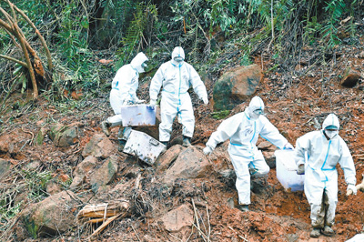 3月25日上午,“3·21”东航MU5735航空器飞行事故现场的搜救人员在运送飞机残骸。