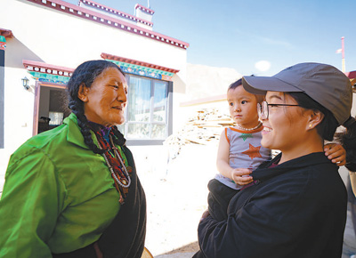 双湖县措折羌玛乡干部边巴拉姆(右一)在搬迁群众家走访。 |