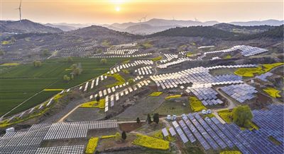 图为宿州市埇桥区曹村镇,山边数百亩油菜花相继盛开,与光伏板、风机相互映衬,构成一幅乡村美景图。