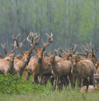 湖南东洞庭湖国家级自然保护区内的野生麋鹿群。 |