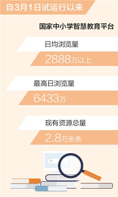 记者近日从教育部了解到,自3月1日试运行以来,国家中小学智慧教育平台累计浏览量达7.2亿,日均浏览量2888万以上,最高日浏览量达6433万。