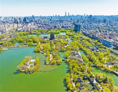 4月1日,山东济南大明湖景区风和日丽,碧波荡漾,绿意盎然。