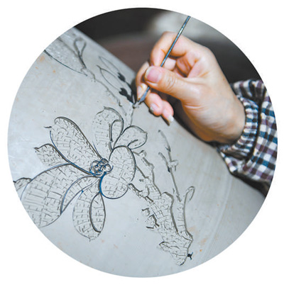 云南建水紫陶制作过程中的陶坯刻花环节。 |