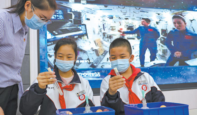 3月23日,在新疆维吾尔自治区乌鲁木齐市第七十中学,学生在收看“天宫课堂”第二课的同时进行科学实验。这次太空授课活动在乌鲁木齐设立了地面分课堂。在收看“天宫课堂”活动中,各族学生进一步增强了对中华民族的认同感和自豪感。 |