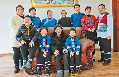 广西壮族自治区龙胜各族自治县泗水乡龙甸村侯光祖一家由壮族、汉族、苗族、瑶族、侗族5个民族组成,共11口人。图为今年春节期间,侯光祖(右一)一家欢聚一堂拍摄全家福。 |