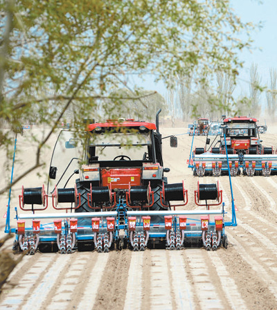 近年来,新疆维吾尔自治区农业机械化率稳步提升。图为新疆生产建设兵团第三师五十团抢抓农时,利用无人驾驶农机进行作业,提升播种效率。 |