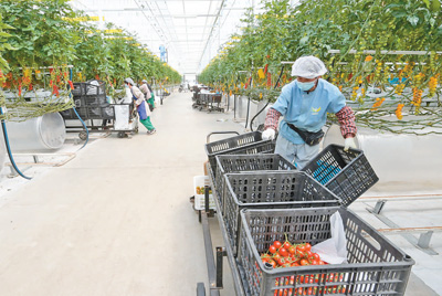 连日来,上海市崇明区各蔬菜生产、加工企业积极组织人力物力,提升蔬菜供应能力。图为四月十九日,在崇明区中兴镇的一个种植基地,工作人员正采摘小番茄。