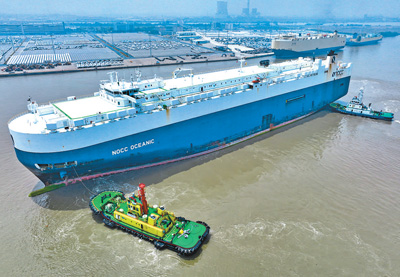 图为4月21日,广州港南沙汽车码头迎来首条滚装南美准班轮航线,广汽、东风等品牌汽车将搭乘以星航运的“海洋力量”轮远销南美。