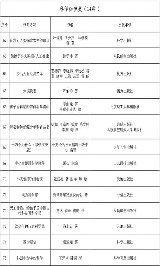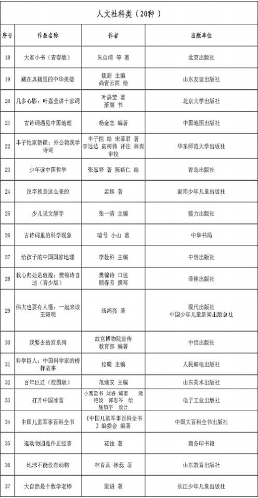 经过论证评选,最终确定向青少年推荐《习近平与大学生朋友们》《红色气质》《大家小书(青春版)》《藏在典籍里的中华美德》《乌兰牧骑的孩子》《我和小素》《征程:人类探索太空的故事》《给孩子讲大数据/人工智能》《美丽中国·从家乡出发》《童心战“疫”·大眼睛暖心绘本》《红游记》《中华传统文化名家课堂音频库》等100种精品出版物(书目见下图),内容涵盖宣传阐释习近平新时代中国特色社会主义思想,深化党史学习教育和“四史”宣传教育,践行社会主义核心价值观,弘扬中华优秀传统文化,培育美育素质,培养科学精神等方面。这些作品具有较强的思想性、艺术性、可读性,符合青少年认知规律和阅读特点,是近年来我国青少年读物原创出版成果的集中体现。