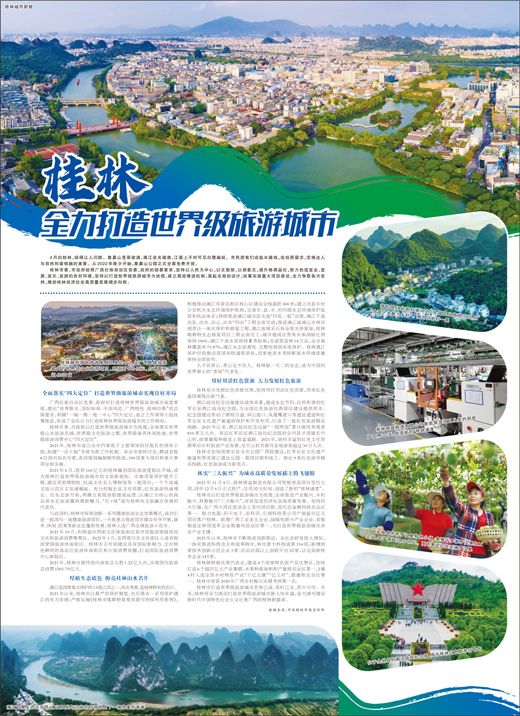 桂林市委、市政府以打造世界级旅游城市为统揽,全面落实世界级山水旅游名城、世界级文化旅游之都、世界级康养休闲胜地、世界级旅游消费中心“四大定位”。