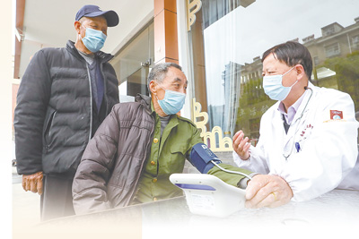 浙江省湖州市德清县阜溪街道狮山社区,家庭医生服务队为老年人测量血压。 王树成摄(人民视觉)
