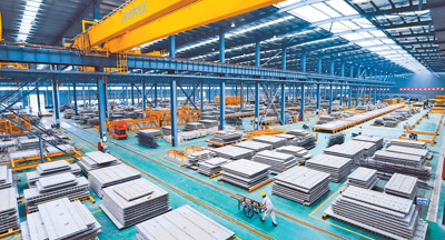 图为当日,江西省湖口县高新园区内的装配式建筑公司生产线正在赶制订单产品。
