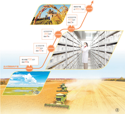 昔日北大荒,今朝北大仓。从小兴安岭南麓、松嫩平原到三江平原,昔日荒无人烟的处女地,今日良田连片、林带交织、城镇棋布,粮食年产量从开垦初期的0.048亿斤跃升到2021年的460多亿斤。如今,北大荒以占全国2.4%的耕地面积,为国家提供了近14%的商品粮。