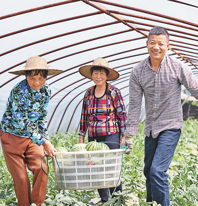 5月2日,浙江省湖州市德清县雷甸镇连菊家庭农场,瓜农正将采摘的西瓜运出大棚。 |
