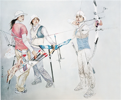 许多美术工作者从现实生活出发,生动刻画当代青年满怀希望、昂扬奋发的精神面貌。如李青稞中国画《天骄》,以精妙的笔触,细致勾勒出3位年轻女子射箭运动员的飒爽英姿。三人均目视远方的靶标。画面右侧的姑娘正屏住呼吸、开弓引箭,笃定而自信。孙震生中国画《蝶舞星河》,则以俯视的视角,描绘了一位花样滑冰女选手在冰面上翩翩起舞的优美姿态。女选手神情愉悦、动作舒展,尽显运动员胸有成竹的风采。张辉版画《向光注视》,以三联画的形式,并置不同职业的当代青年肖像。富有现代审美的画面语言,展现了青年一代从青涩走向成熟、走向坚定的精神面貌。