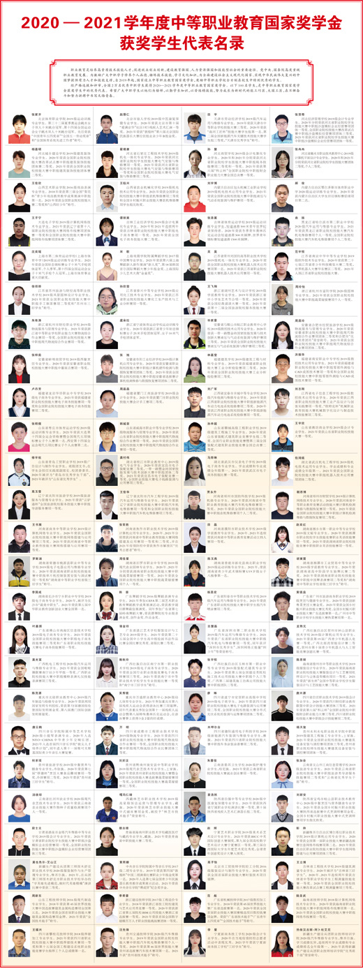 经严格选拔和评审,全国2万名优秀中职学生获得2020—2021学年度中等职业教育国家奖学金。以下100名学生,是中等职业教育国家奖学金获奖学生中的优秀代表。希望广大中职学生以他们为榜样,以勤学长知识,以苦练精技能,努力成长为新时代的能工巧匠、大国工匠,在不懈奋斗和努力拼搏中书写无悔青春。