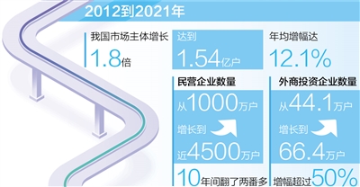 营商环境是市场主体生存发展的土壤,环境优则企业兴。从2012到2021年,我国市场主体增长了1.8倍,达到1.54亿户,年均增幅达12.1%,民营企业数量从1000万户增长到近4500万户,10年间翻了两番多,外商投资企业数量从44.1万户增长到66.4万户,增幅超过50%。