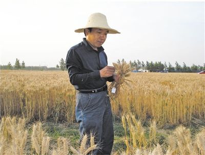 李立会在试验基地观察小麦材料。 |
