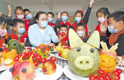 5月20日是“中国学生营养日”。近日,山东省东营市东营区一家幼儿园里,师生把五颜六色的水果、蔬菜制作成各种造型,并在制作过程中了解各种水果、蔬菜的营养价值,引导孩子们不挑食、不偏食,拒绝浪费,树立健康饮食观念。 |